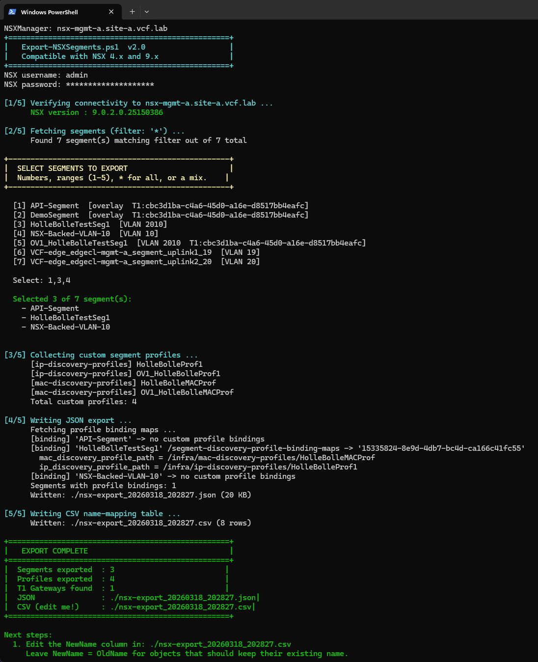 .\Export-NSXSegments.ps1 -NSXManager nsx-source.corp.local -Credential $cred -SkipCertCheck